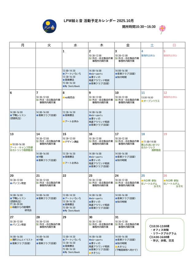 空間でワークショップで制作した作品展示、タペストリー共同制作、CANVAデザイン体験、音楽コーナーの他、楽しい企画を考えています。参加者の皆さんと共に10月に向け計画を膨らませていきます。