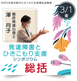 公開直後に定員に達した「発達障害とひきこもり支援」シンポジウム(2023年9月3日) 🔗 のダイジェスト動画を見ながら、当日の進行を担当していただいた 澤 月子先生に、シンポジウムの成果を今後につなぐための総括をしていただきます。